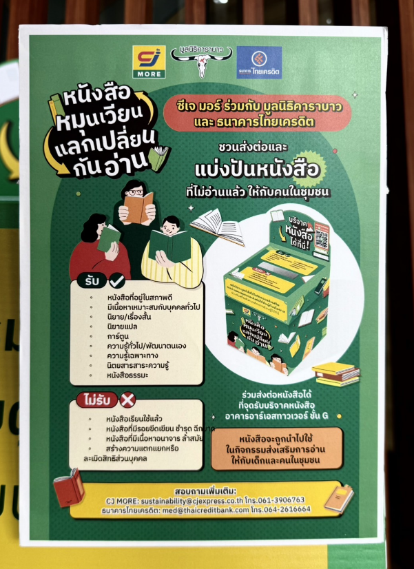 บริษัทฯ เข้าร่วมโครงการ “หนังสือหมุนเวียน แลกเปลี่ยนกันอ่าน” เพื่อแบ่งปันหนังสือที่ไม่อ่านแล้วให้กับคนในชุมชน ที่จัดทำขึ้นโดย ซีเจ มอร์ ร่วมกับ มูลนิธิคาราบาว และธนาคารไทยเครดิต บริษัท วี.วรรณ แอสเสท จำกัด ขอเป็นส่วนหนึ่งในการส่งต่อ ร่วมแบ่งปันสิ่งดีๆ ให้กับผู้อื่นต่อไป